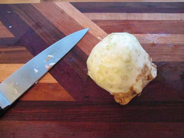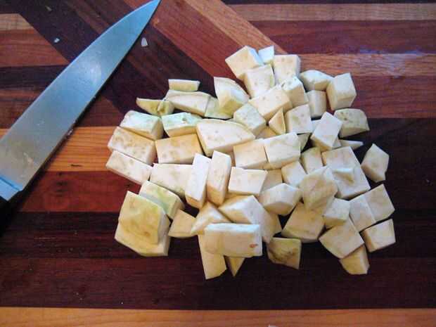 Pelar y picar las zanahorias, chirivías y raíz de apio en cubos de 1" y añadirlos a la mezcla.