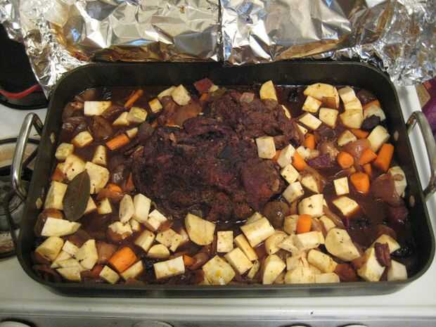 Si usted prefiere una carne asada un poco más dulce, agregar en 1/2 taza de ciruelas secas sin hueso y a la mitades en este punto también.