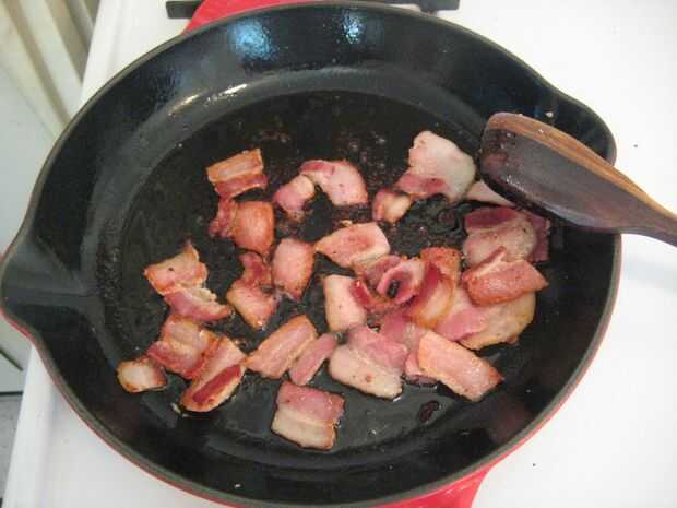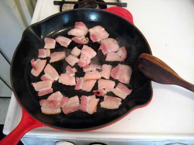Cortar el tocino 1" largo tiras y dorar en una sartén o cazuela.