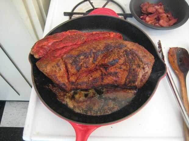 Cocinar de un lado a la vez, para dorar el exterior de la carne en la grasa de tocino. Cocinar cada lado durante unos 3 minutos y luego gire.