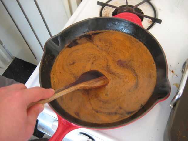 Vierta el vino en la sartén sobre fuego alto y utilice una cuchara de madera para liberar todos los sabrosos pedacitos marrón desde el fondo de la cacerola. El vino todos los bits pegados en la parte inferior de la bandeja le ayudará a salir, y cuando termines, si has rascado bien, el molde debe estar limpio.