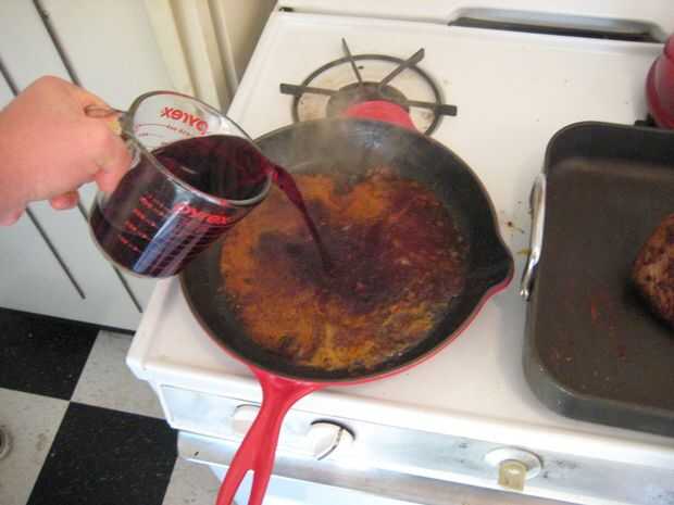 Hervir apagado el alcohol en el vino durante unos minutos y reducir el volumen un poco. Después de que se cocinen durante 10 minutos o menos, verter la salsa en la cacerola de la asación alrededor de la carne de vacuno.