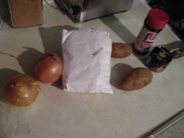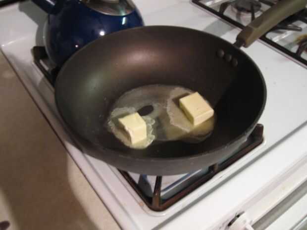 Primero tienes que descongelar la carne para que los trozos no están congelados juntos. Entonces, después de montar los ingredientes, pelar y cortar las patatas en círculos y las cebollas en trozos pequeños. Mientras corta las verduras poner la mantequilla en la sartén y empezar a derretir sobre la estufa (revuélvalo de vez en cuando para que no se queme). Después de que termines estarás listo para empezar la cocción.