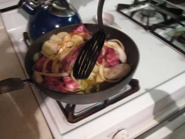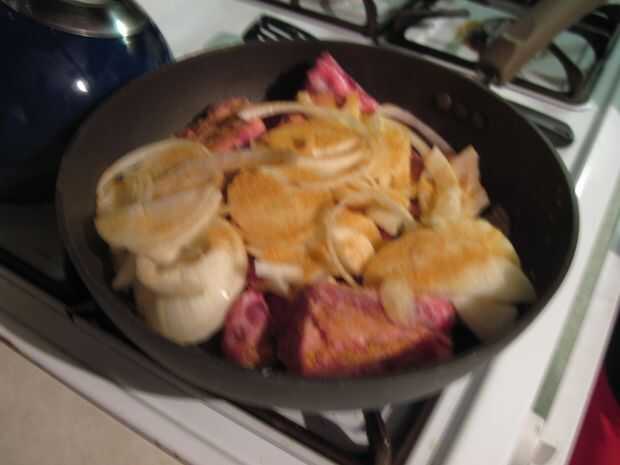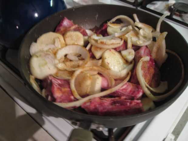 Después de tirar las cebollas y las patatas y se cocina todo, la temporada. Puede la temporada a sus preferencias, pero hemos sazonado la carne ligeramente en ambos lados. Puede lanzar el licor cualquier momento, pero más adelante usted ponerlo en más fuerte afecta el sabor.