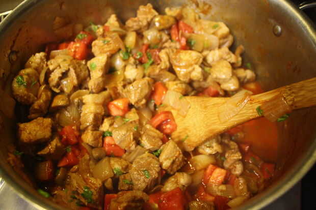 Remover y cocer a fuego lento unos 5 minutos para que los jugos se mezclan. Si es sobre todo caldoso, puede hervir a fuego lento más tiempo para reducir el líquido a un nivel más manejable.