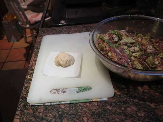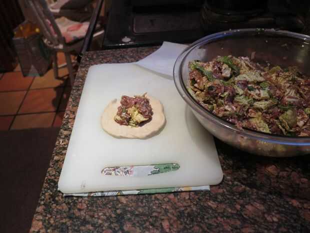 Cuadro 3. colocar alrededor una cantidad de 1 1/2 cucharada de relleno en cada uno, el relleno hecho suficiente para 16 Baozi, pero estaba relativamente generoso con mi relleno.