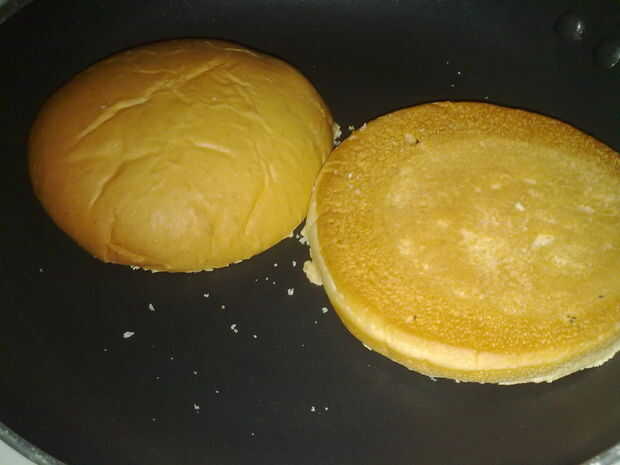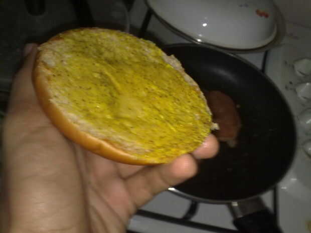 2) Coloque sobre el una cacerola antiadherente para darle el asado más leve posible - esto se hace para que la parte ligera obtiene una firmeza ligera que tan fácil de aplicar la salsa de tomate y mostaza3) ahora aplicar una capa de pasta de mostaza en la parte superior del moño