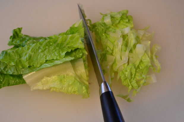 Picar la lechuga ~ usted puede cortar las hojas longitudinalmente primero (para que no terminen con filamentos muy largos) y luego finamente rebanada.