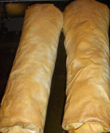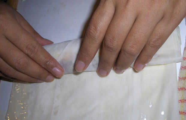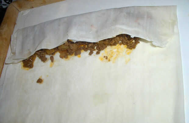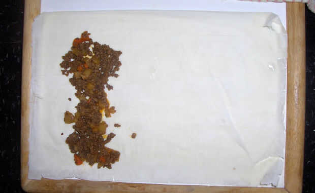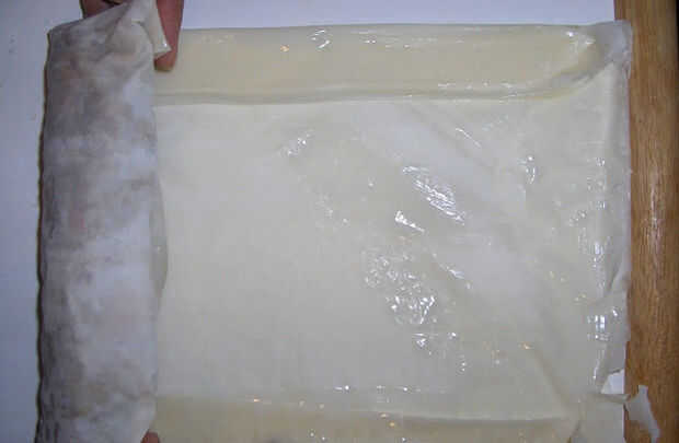 2 filo apilar juntos, lugar relleno y cepillo lados del filo con margarina derretida, a continuación, rodillo
