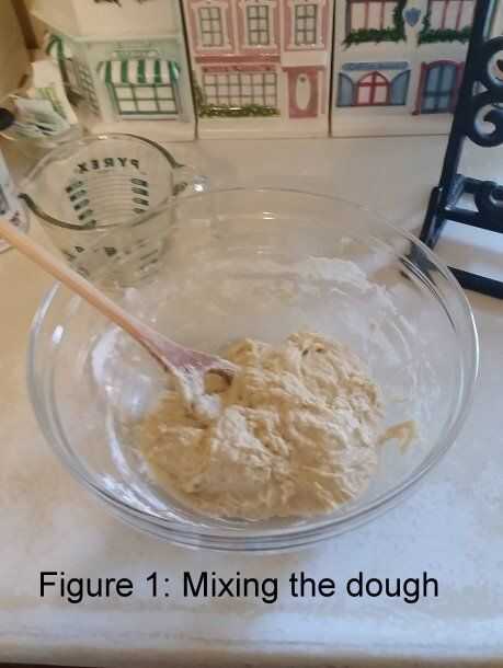 Hacer un pozo en el centro de los ingredientes secos. Vierta el líquido (agua y huevos). Mezclar bien con una cuchara de madera. La mezcla será pegajoso (Figura 1). Cubrir y dejar descansar unos 10 minutos.