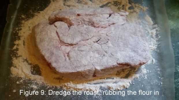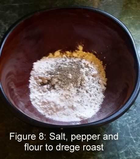 Mezclar la harina, la sal y la pimienta en un plato bajo o sobre papel encerado (Figura 8). Dragar la carne por ambos lados, frotar la harina en el asado (Figura 9). Guarde la harina que no se pegue a la carne.