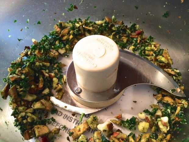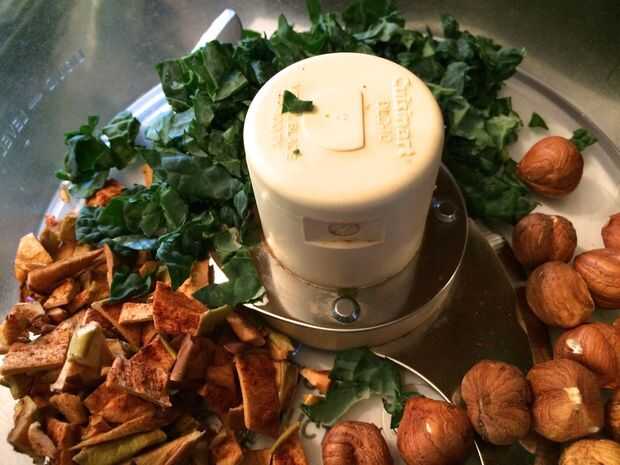 Añadir las piezas de la col rizada y Manzana deshidratada picada a un procesador de alimentos junto con 1/2 taza tostado avellanas; Pulse varias veces, hasta que las tuercas están bien picadas.