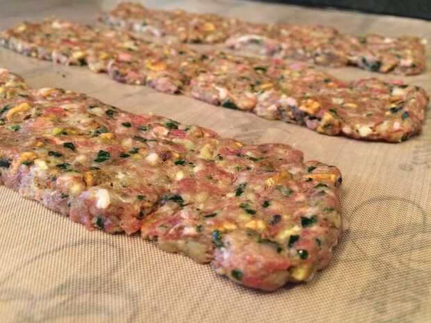 Formar cada parte un tronco rodando entre sus manos, luego coloque en una hoja antiadherente deshidratador y aplanar en forma de rectángulo, aproximadamente 1/4" de espesor. * También puede usar porciones más pequeñas y forman en círculos.
