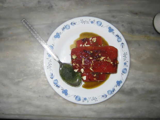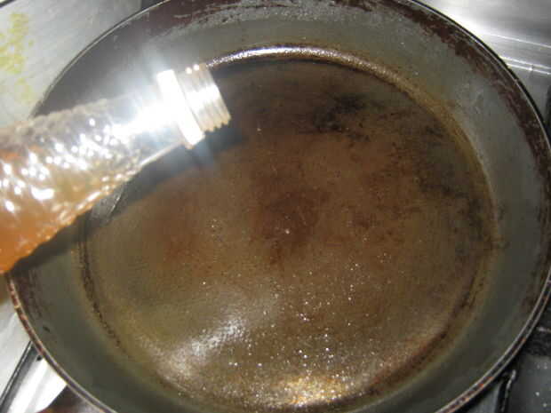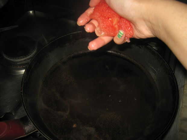 Volver la sartén al calor y desglasar con el jugo de sandía