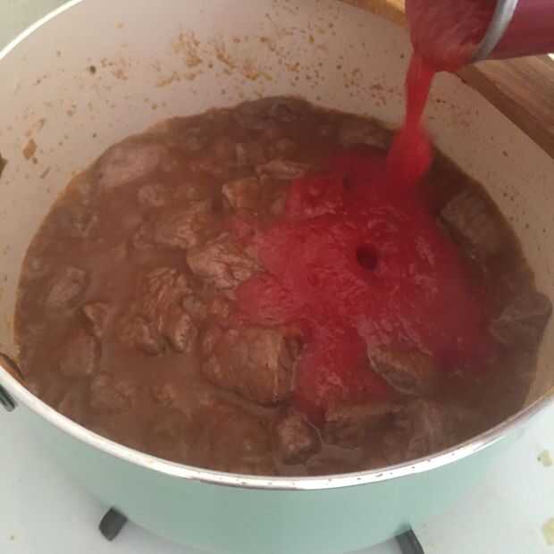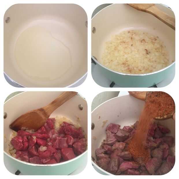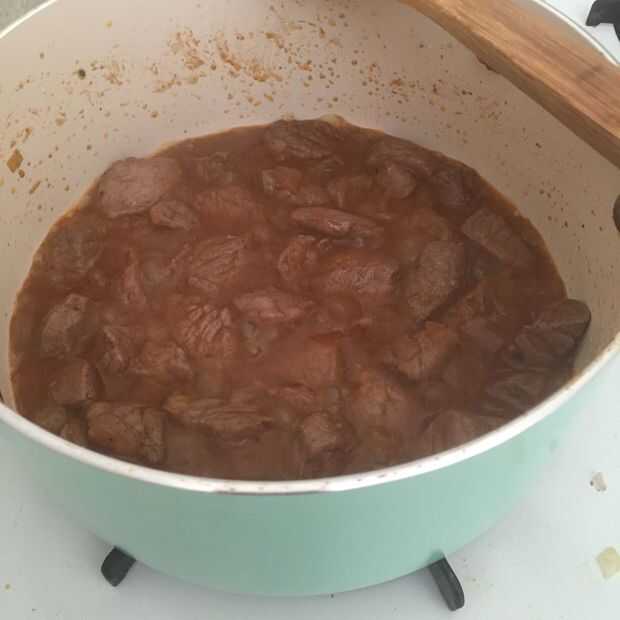En una salsa de la cacerola el aceite y añadir la cebolla picada. Saltear la cebolla hasta que se convierte un poco claro. Agregar el filete en cubos y revolver la carne ligeramente marrones y es cubierta con el aceite. Agregar la sal, pimentón, pimienta y orégano y revolver bien. Hierva a fuego medio, revolviendo ocasionalmente hasta que la carne se cuece en su propio jugo. Agregar la salsa de tomate y revolver bien.