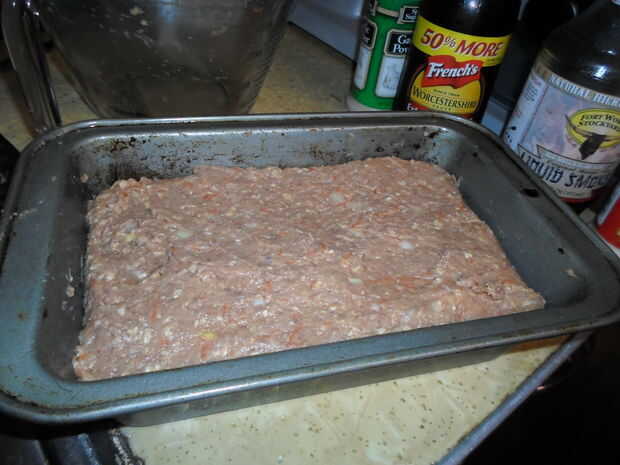 Ligeramente rociar un molde con aceite, poner en la mezcla de carne, alise la parte superior... y su lista para el horno.