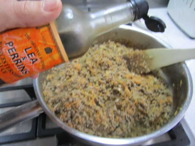 Luego agregar la salsa inglesa y cocinar durante 5 minutos hasta que la mayor parte del líquido ha sido absorbida.