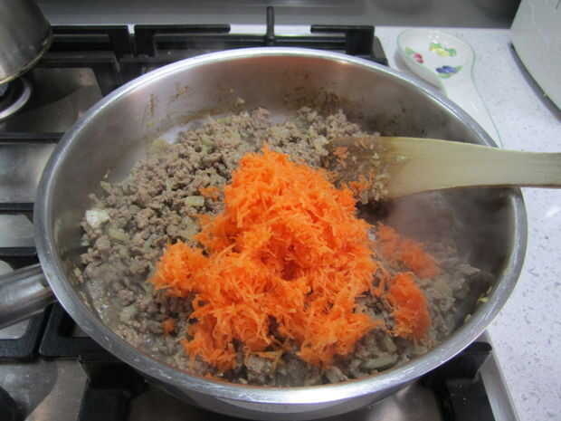 Añadir zanahoria rallada a la cacerola y revuelva hasta combinar bien.