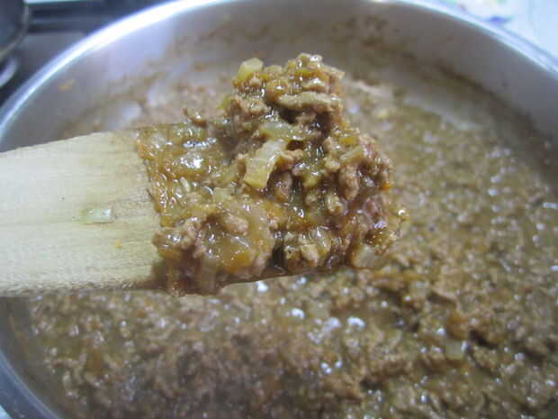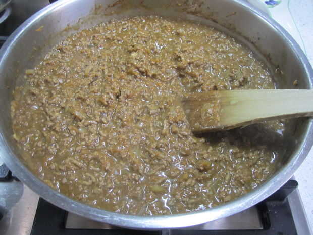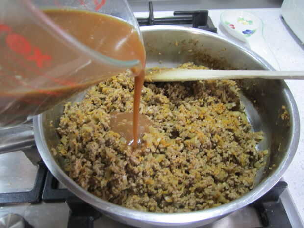 Vierta la salsa ligeramente engrosada en la mezcla de carne picada y revuelva hasta combinar bien.