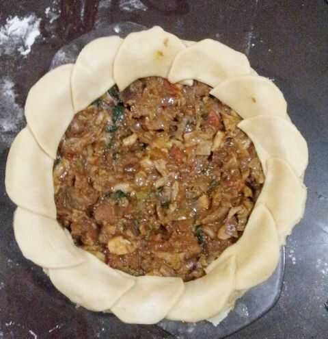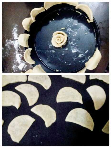 Ahora toma su plato de pastel y rellenarlo con el relleno. Coloque los pétalos exteriores (que no era al horno medio) en los bordes del plato. Generalmente en un pastel de los bordes se queman rápido. como tienes ya la mitad al horno las piezas para el centro de la tarta debe poder obtener un color uniforme de.