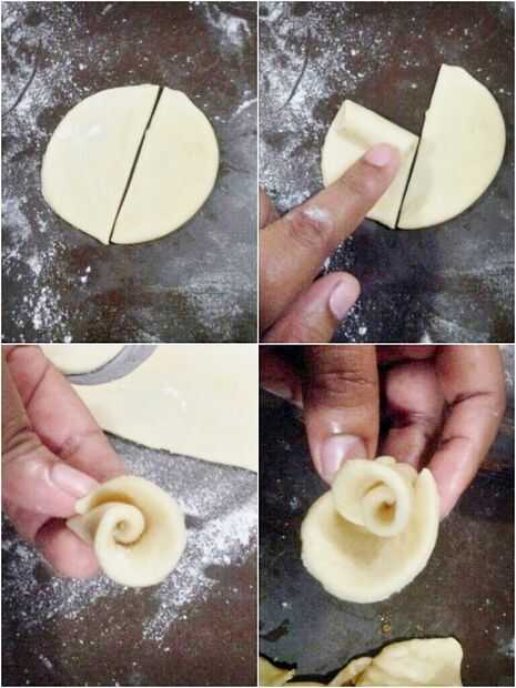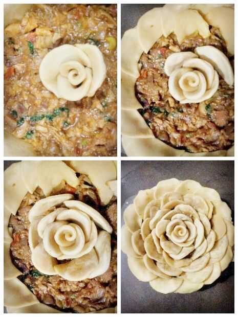 Ahora coloque la yema en el centro y poco a poco Coloque los pétalos alrededor como se muestra en la imagen. Si le resulta difícil hacer los pétalos en, mover el relleno un poco con un cuchillo y empuje el pétalo así que mantendría una posición vertical. Glasear el pastel y hornee. Eso es todo!
