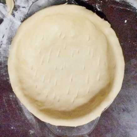 Primero para que tu pastel debe hacer la base. Así que estirar la masa y cuelgue de su plato. Presione las esquinas y bordes. Corte el exceso.