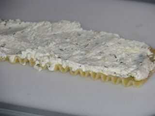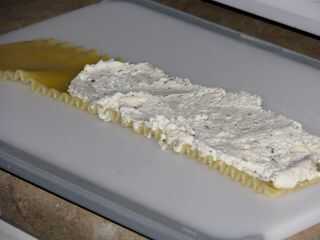 Parte de la mezcla de requesón repartidas de los tallarines cubriendo todos los tallarines excepto aproximadamente 2 pulgadas de un extremo.