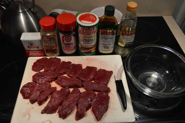 Tomar las unidades crudos de carne y quite todos los tendones, grasa y limo. Luego cortar en filetes gruesos de 1/4-1/2 pulgadas. A continuación colocar los filetes sobre una tabla para cortar y usar un tenedor para perforar la carne (ablandar). Una vez hecho esto, estás preparado para marinar!