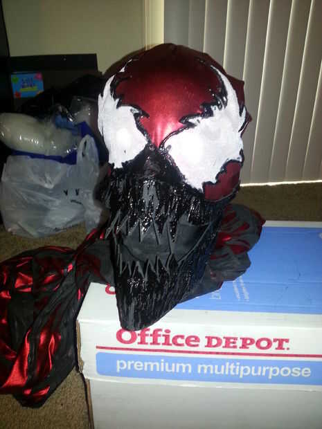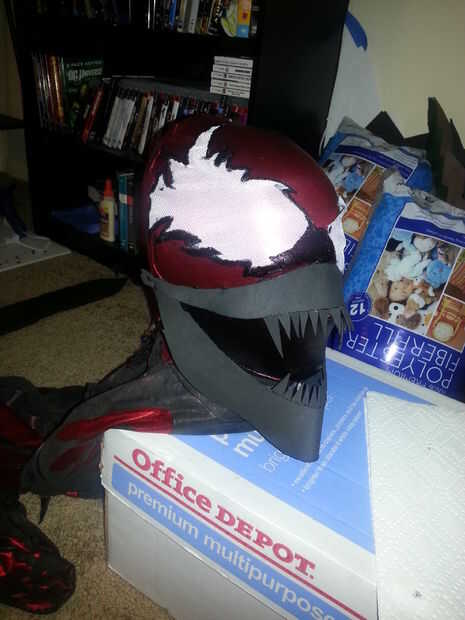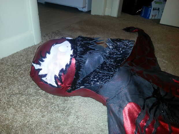 6) ahora tendrá que ser un poco artístico con el pegamento caliente. De color todos los puntos que usted desea tener la mirada simbiótica con la caliente. Llené en la mayoría de la zona de boca y la nariz para dar la humedad dejando caer el estilo de los ojos. Puede hacer lo mismo, o llenarlo todo. Tenga en cuenta, no caliente el pegamento de la máscara una vez aplicada, así que ten cuidado con tu elección.