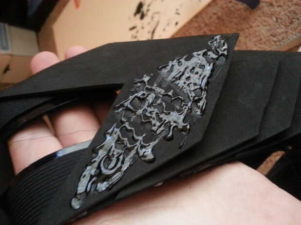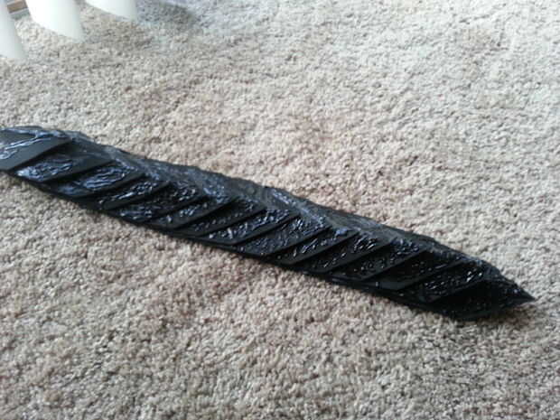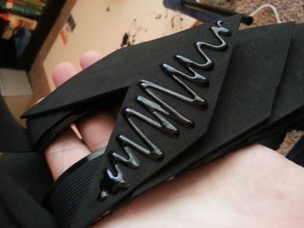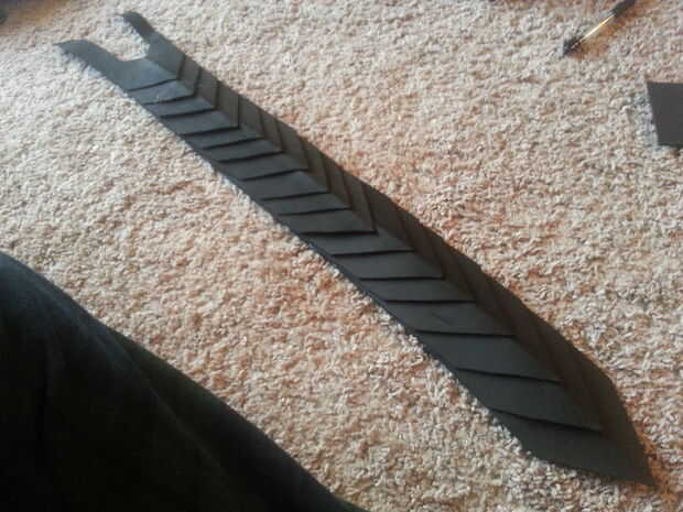 3.) usando el estiramiento elástico, corte una tira larga (probablemente de su trasero a la cabeza de una buena longitud de su cuerpo) y pegamento caliente las escamas en una línea de manera superpuestas la una anterior por aproximadamente una pulgada. (utilice las fotos de arriba para tener una idea de cómo desea que las escamas se superponen) Hacer esto a ambos lados de la balanza.