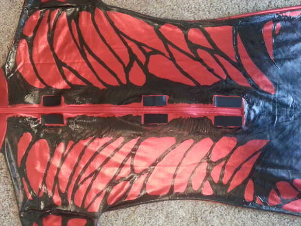 Agregar 6.) el lado del Velcro borroso a la columna vertebral en puntos paralelos para los trajes de Velcro. Puede que necesite añadir un poco de caliente pegar el adhesivo de Velcro para pegar el elástico más fácil conseguirlo. Sólo tiene que añadir 2 puntos o pegamento caliente, no mucho.