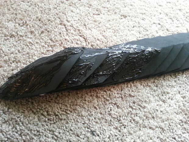 4.) lamentablemente no tengo una foto de la cinta de Velcro en el palo antes de pintar, pero tengo uno después de la pintura y antes de la pistola de calor. Todavía funciona para lo que necesitamos :) Cortar pequeñas tiras de Velcro (laterales de plástico, no el lado difuso) y agregarlos de manera uniforme alrededor de la cremallera. Usé 6 piezas, 2 en cada lado un tercio mi columna vertebral. Utilice la columna vertebral a la línea hasta donde quieras. Asegúrese de que no añadir demasiadas escalas haciendo demasiado largo. NO AGREGUE EL VELCRO LA COLUMNA TODAVÍA.