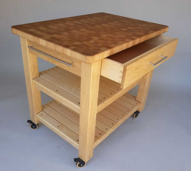 La tapa de bloque de carnicero sobresalga 2" en ambos lados y 1 1/4" frente y dorso. La parte superior es de 37 ¾" de ancho, 26 5/8" y 1 ½" de espesor. Todo el proyecto se hace de arce.