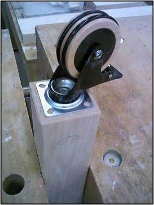 Esto también es un buen momento para perforar los agujeros en la parte inferior de las piernas de las ruedas. Coloque una pierna en un tornillo, coloque la rueda y marque la ubicación del agujero. Utilice una 1/8" pedacito de taladro y taladrar los cuatro orificios de montaje.