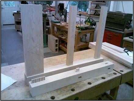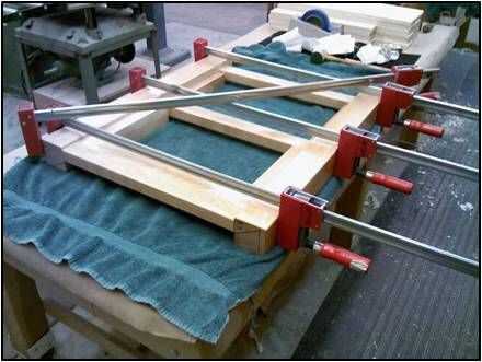 Unte el pegamento en las mortajas sobre una pierna. Unte el pegamento en las espigas de la plataforma y los dos tirantes y colocarlos en las mortajas de pierna. Repita el proceso para la otra pierna, la pierna sobre el delantal y camillas.
