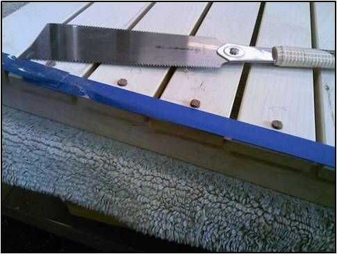 Utilice cinta de pintor azul para proteger la superficie de las lamas. Use una sierra y cortar la parte superior de las clavijas.