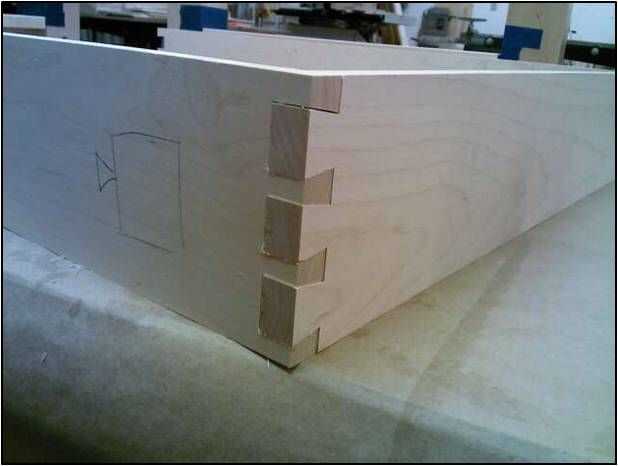 usé una plantilla de cola de Milano de Leigh para cortar los dientes a través del cajón. Siga las instrucciones en el manual del usuario.