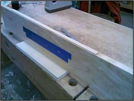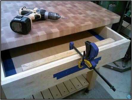 Desde el frente del cajón se terminó antes, utilicé cinta de enmascarar de pintor azul para proteger el acabado. Usé 1/16" trozo de madera como un espaciador y pegadas a la parte superior de la gaveta para asegurar la posición de la gaveta adecuada.