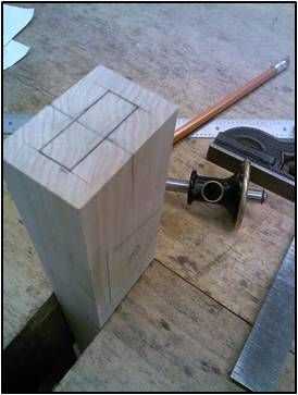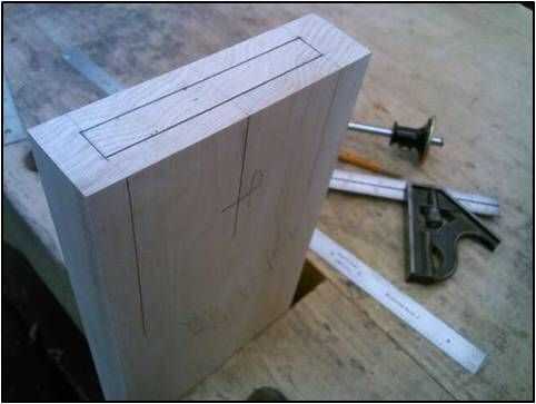 Marque las posiciones de las mortajas de los delantales y camillas. Las mortajas son ½" de ancho y 1" de profundidad. Las mortajas se centran en el grueso.