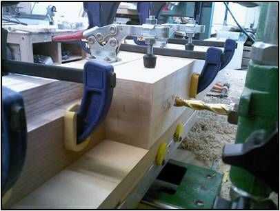 Las patas son cuadradas de 3" así que tuve que hacer una base especial para fijar las patas a la fresadora horizontal.