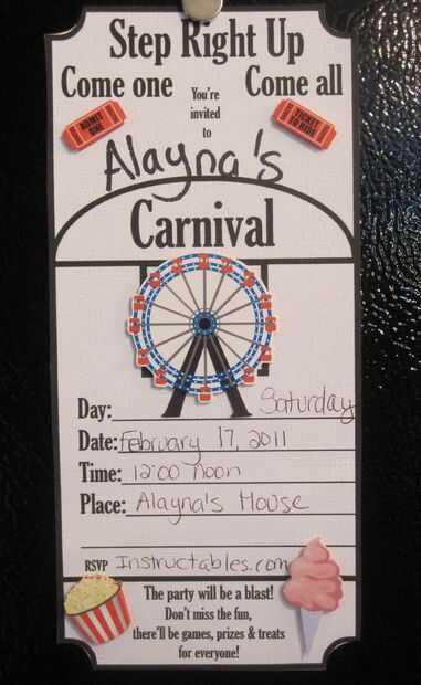 También he añadido dos invitaciones que se hacen con cartulina blanca simple. Cuesta un centavo, pero todavía tiene una gran mirada. Incluso podría tener su hijo dibujar de carnaval poco sobre ellos. Simplemente rellene la información y estás listo para ir.