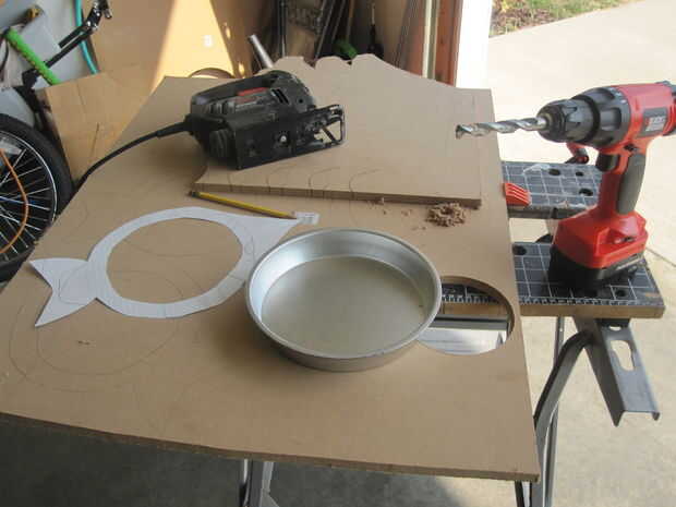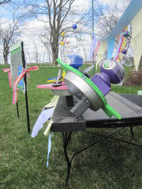 Cada alien tiene una nave espacial hecha a mano de moldes MDF tablero y metal. Los moldes eran de la tienda de dólar.
