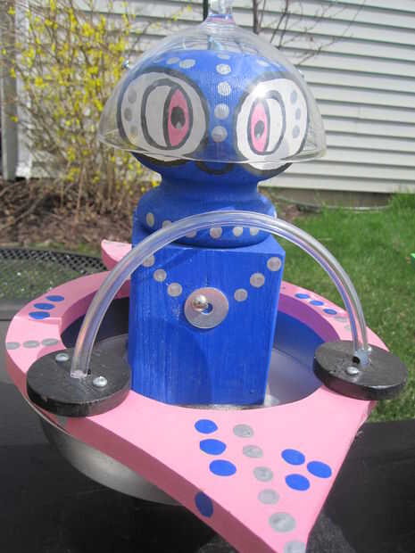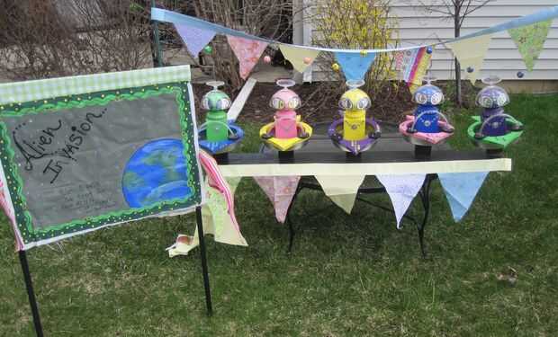 Los aliens están hechos de un poste de 4 x 4 cortado en cinco partes iguales. Cabezas de los aliens son primeros de la valla. El plástico transparente helmuts son tazones de fuente boca abajo plástico helado.