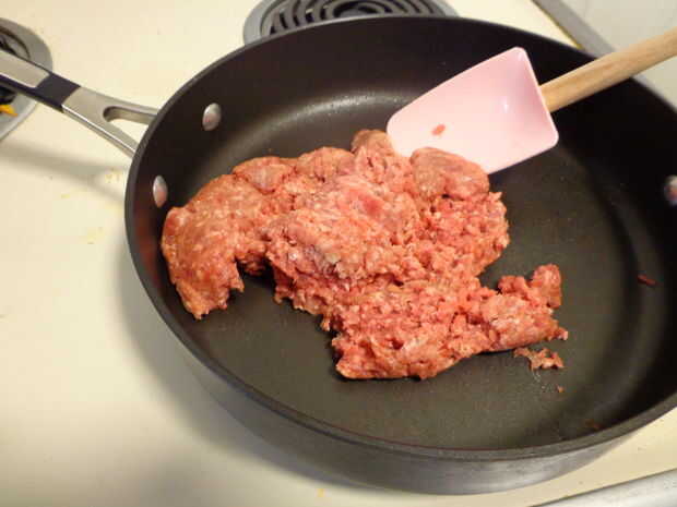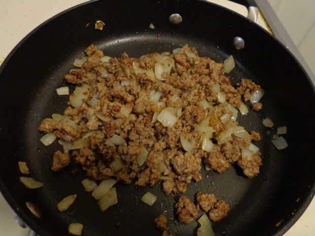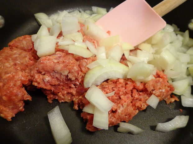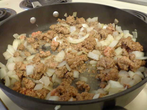 Saltear la cebolla y la carne picada sobre fuego medio alto, condimento con sólo una pizca o dos de sal de ajo, hasta que la carne esté bien dorada.