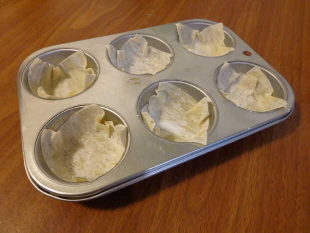 Coloque un contenedor de won ton en cada pozo y presione hacia abajo para que cubra el fondo y los lados de la lata.