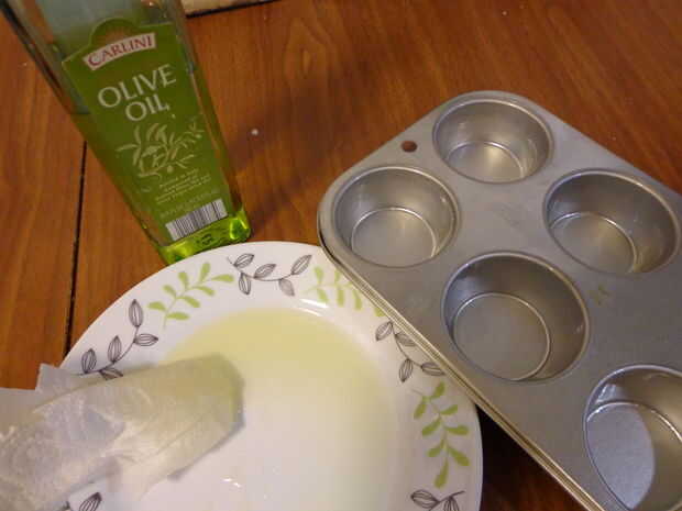 Con un poco de aceite de oliva, generosamente engrasar cada pozo de su bandeja de Magdalena.