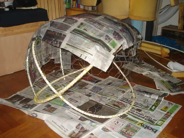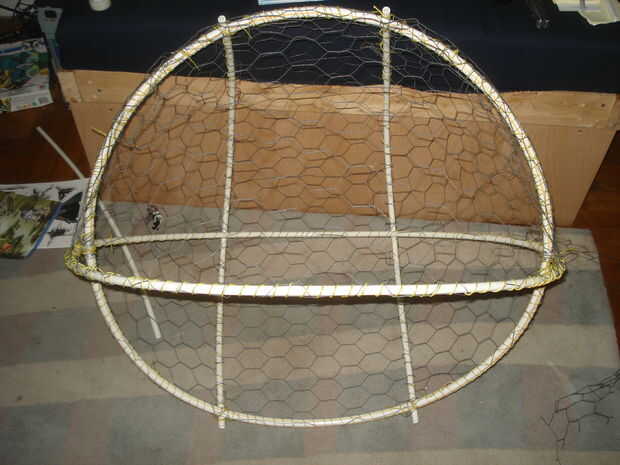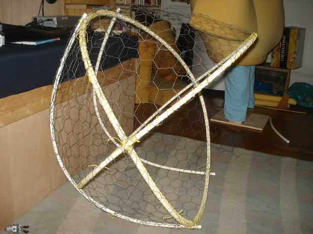 La cabeza es un gran trabajo. Se trata básicamente de un marco de tubo de pvc y alambre de pollo cubierto de papel maché. Actaully basado las principales dimensiones de la cabeza en un aro de hula. 2 aros de hula o tubo de pvc en el mismo tamaño atacó junto con el alambre en los ángulos right-ish y luego dos bits extras de tubería trincadas en apoyar la parte posterior de la cabeza-vea las imágenes de abajo. Alambre de pollo es recortado a la forma correcta y azotado en el fram con guita. En las fotos, como se señaló, el alambre de pollo cubiertas de la cabeza de la parte posterior del cuello al labio superior. Hay algunos básicos que forma en la porción de la cara, pero la nariz y la frente se añadirán en como espuma esculpida más adelante. Alambre de pollo no es fácil trabajar con, es agudo y nace y está sucio. Es por ello que me resulta más fácil cortarlo en trozos más pequeños y atarlos juntos. Si usted consigue rasguñada, desinfectar bien. ¿Tal vez considerar una antitetánica?