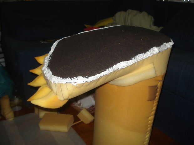 Todos los cuernos y garras se hacen del mismo modo; de recortes de la hoja de la espuma. Los grandes cuernos en la cabeza se hacen de los dardos cortados fuera del cuerpo en el frente del cuerpo y la espalda. Pegué un doble grosor de espuma en forma de triángulo áspero de los cuernos. Entonces es sólo una cuestión de talla la forma correcta en detalle. Goma espuma suave como esto no es fácil de tallar porque se mueve. La mejor manera que he encontrado es utilizando unas tijeras muy afiladas para sacar virutas más pequeñas y más pequeñas de espuma. Cualquier corte alrededor del borde produce un canal ligeramente cóncavo con dos crestas elevadas. Usted puede mantener cortando las crestas hasta obtener algo cercano a Lisa. También los cuernos y garras se suponen que para mirar un poco desiguales, por lo que un par de crestas izquierda OK.