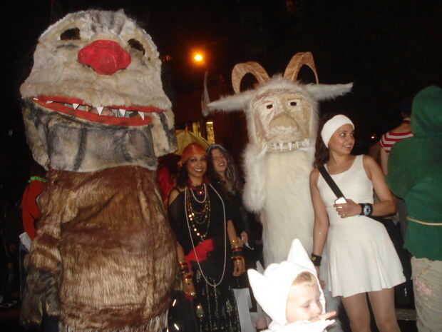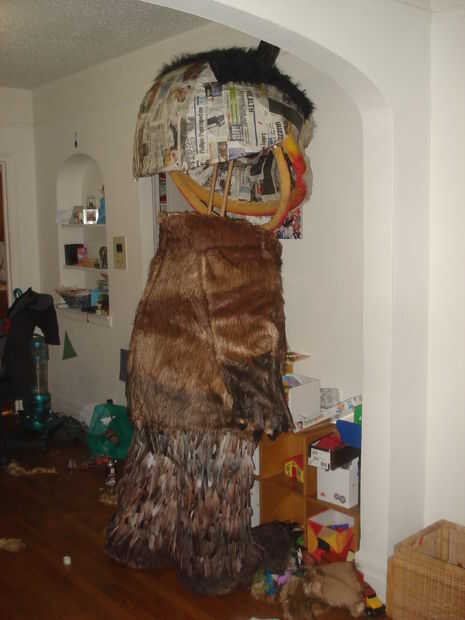 Con lo que quedaba, logró encontrar bastante negro para cubrir totalmente la cabeza y de la piel de la cara crema sirve para poner una falda alrededor de la espalda que le cuelgan hasta los hombros. En la parte posterior, esto fue unida con un par de trozos de cadena para mantenerla en su lugar. Entonces una configuración muy similar alrededor de la parte delantera de la mandíbula inferior colgando. Mientras tanto, mi esposa corta unos triángulos blanco de espuma de arte para los dientes de Carol. Estos pegan dentro del labio superior. Y hemos terminado.