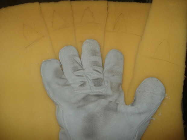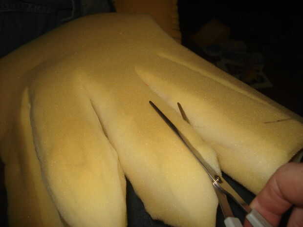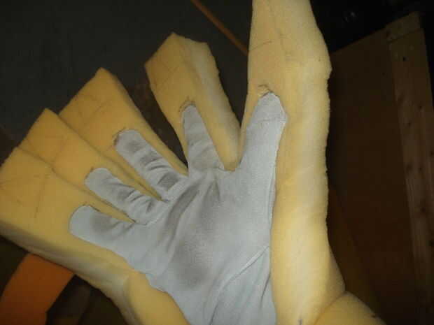 Entonces usted quiere cortar la espuma entre los dedos, por lo que es una buena idea que han marcado/pegado los guantes con los dedos separados hacia fuera. Desea contar con los dedos de espuma unos 0,25" más ancha que los dedos de guantes siempre que sea posible y unas pocas pulgadas de largas - sin embargo mucho que imaginar extensiones de dedos y garras siendo, hay todos vamos a cortar de esta espuma. Usando un cuchillo x-acto, cuidadosamente corte una forma de guante con sangría en la espuma para que el guante se termina realmente fijado en la espuma. Cuando la mano está en el guante debe estar completamente dentro del nivel de la espuma, así que usted va cavando en espuma tan profundamente como los dedos son gruesos. Luego pegar los guantes en el espacio que sólo has cortado. Para los dedos, la mejor manera que encontré para hacer esto es poner la mano en el guante, apriete pegamento caliente alrededor del dedo y luego con su otro apretón de la mano la espuma alrededor de usted con guantes dedo. Como antes, esto dolerá, pero probablemente no realmente quema. Sólo ten cuidado.